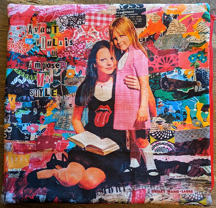 des housses de coussins avec des tableaux imprimés sur une face et un beau tissu recyclé au dos